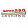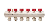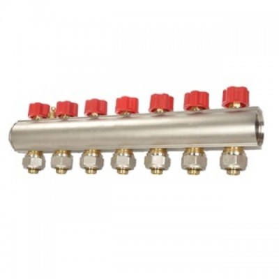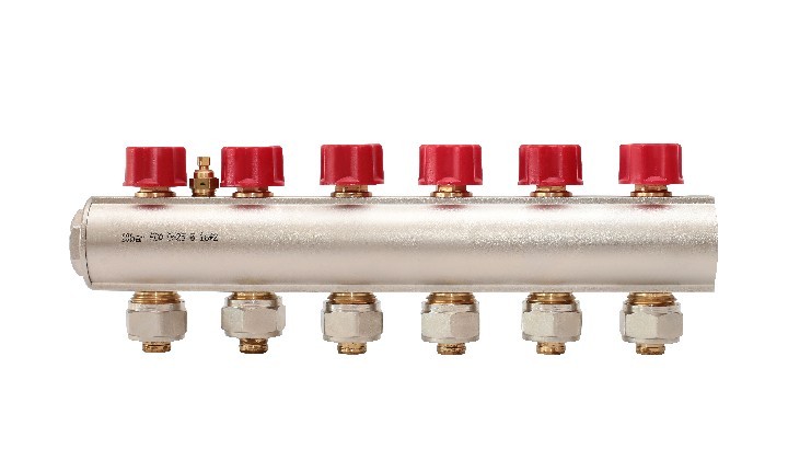 Колектор з вбудованими вентилями на 3 виходи, ручки вбудованих вентилів червоного кольору. Ремонтопридатен. Вбудовані перехідники штуцерного типу для підключення полімерних труб діаметром 16 мм з товщиною стінки 2 мм, універсальні, підходять для труби будь-якого типу (PEX, металопластик), не вимагають спеціального інструменту для підключення. Укомплектований торцевою заглушкою 1" з ущільненням і вбудованим ручним випускачем повітря. Вбудований вентиль з ущільнювачами EPDM дозволяє регулювати проток окремо по кожному підключеному контуру. Використовується в системах радіаторного опалення (двотрубна, променевого типу, вентилі замість радіаторних вентилів), системах теплої підлоги (вартість нижче спеціальних блоків теплої підлоги, є можливість регулювання протоку по кожному контуру, проливки петлі, дуже компактні) і системах водопостачання (дозволяють забезпечити однаковий проток в кожному змішувачі, вентилі використовуються замість сантехнічних кранів). Як правило, використовуються парами: червоні-сині ручки, подача-обратка, холодна-гаряча вода, для монтажу використовуються спеціальні кріплення ЕСА з хомутами, які повторюють профіль балки.