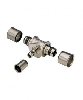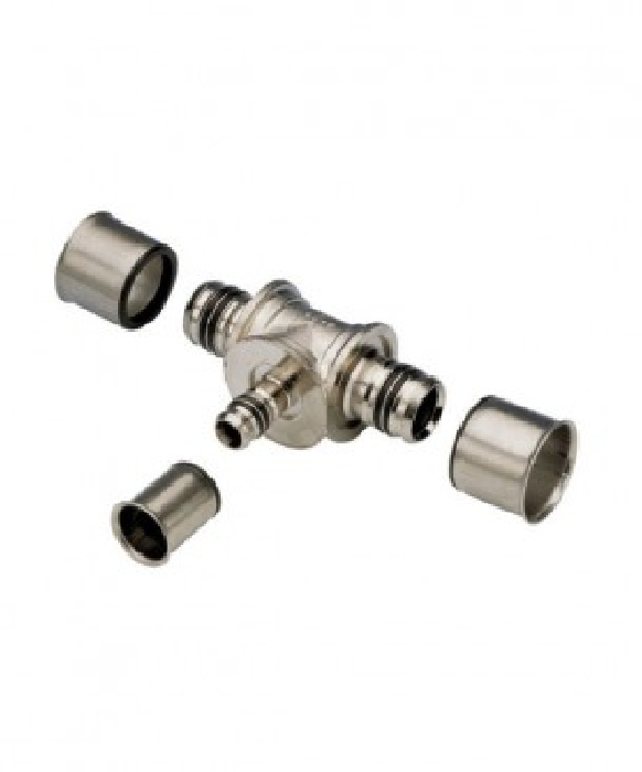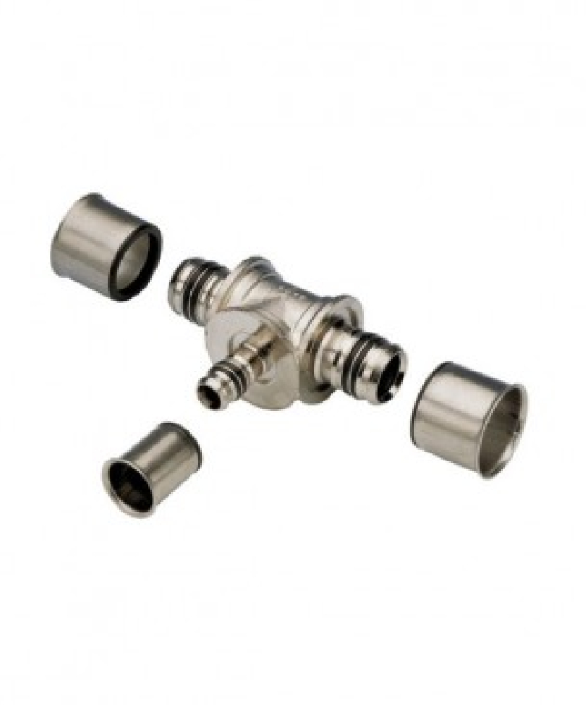 Пресс-фитинг – тройник равнозначный 16. Используется для врезки в трубу отвода того же диаметра. Применяется в системах водоснабжения и отопления для монтажа с металлопластиковыми трубами (PEX-AL-PEX, PEX-AL-PE, PE-AL-PEX, PEX-AL-PERT). Номинальное рабочее давление - 25 бар, диапазон температур от -30 до +115°С для труб диаметром 16 мм с толщиной стенки 2мм. Материал - никелированная латунь, гильза - нержавеющая сталь, уплотнительные кольца - EPDM, для опрессовки используются губки с профилем U.